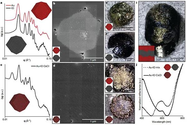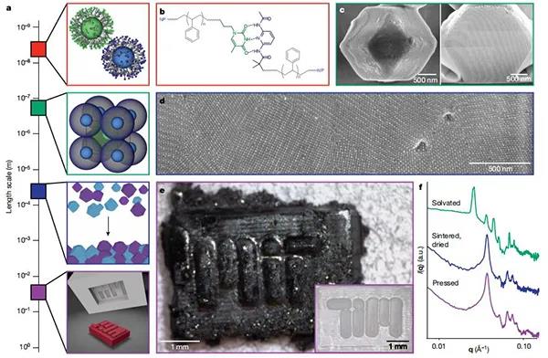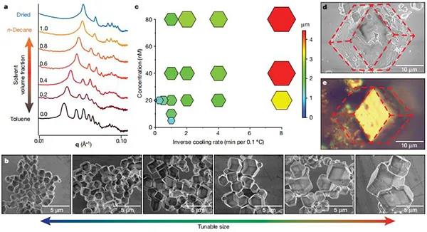 納米顆粒組裝已經(jīng)被提出作為一種理想的方法來構(gòu)建材料的層次組織,通過選擇納米尺度的組件來自下而上構(gòu)建整個材料。多尺度結(jié)構(gòu)控制是非常可取的,這是源于化學(xué)組成、納米尺度順序、微觀結(jié)構(gòu)和宏觀形式都影響物理性質(zhì)。然而,通常決定納米顆粒有序的化學(xué)相互作用,并不能提供任何在更大長度尺度上操縱結(jié)構(gòu)的手段。微觀結(jié)構(gòu)和宏觀形態(tài)仍然是未充分探索的設(shè)計參數(shù),開發(fā)能夠?qū)蝹€自組裝結(jié)構(gòu)結(jié)合成宏觀的加工技術(shù),將是開發(fā)在所有尺寸狀態(tài)下具有完全結(jié)構(gòu)控制的納米顆粒的重要步驟。因此,基于納米顆粒的材料開發(fā)需要在不犧牲其自組裝納米級排列的情況下,定制微觀和宏觀結(jié)構(gòu)的加工策略。其中,納米復(fù)合技術(shù)(NCT)非常適合生產(chǎn)此類分層材料,源于其固有的可伸縮成分組成,并使用動態(tài)結(jié)合相互作用來決定納米顆粒如何排列成有序陣列。每個NCT均由覆蓋有聚合物的無機(jī)納米顆粒組成,其中每個聚合物鏈均終止于超分子結(jié)合基團(tuán)。將溶劑分散的NCT與互補(bǔ)結(jié)合基團(tuán)混合后,超分子相互作用將顆粒組裝成更大的結(jié)構(gòu)。由于將NCT連接在一起的超分子相互作用是動態(tài)的,因此通過其解離溫度冷卻一系列NCT,可使它們組織成有序的超晶格。然而,由于聚合物鏈在干燥過程中迅速收縮,之前試圖從組裝溶劑中去除晶格的嘗試導(dǎo)致了晶格的混亂。因此,從這些NCTs中形成獨(dú)立的宏觀固體,首先需要一些方法來穩(wěn)定它們,以防止在溶劑去除過程中的順序損失。今日,美國麻省理工學(xué)院 Robert J. Macfarlane教授課題組(通訊作者)提出通過逐漸引入與聚合物發(fā)生不利相互作用的非溶劑來穩(wěn)定晶格,以防止聚合物塌陷,與該非溶劑的相互作用將導(dǎo)致鏈采用較致密的構(gòu)型并使晶格收縮。從而演示了快速組裝以克為單位的多面納米顆粒超晶格微晶的方法,利用此方法這些晶體可以類似于塊狀固體的燒結(jié),進(jìn)一步形成宏觀物體。該方法的關(guān)鍵是:控制納米顆粒組裝的化學(xué)相互作用在后續(xù)處理步驟中保持活性,這使得在形成宏觀材料時,可以保留顆粒的局部納米級有序性。可以根據(jù)超晶格微晶的尺寸,化學(xué)組成和晶體對稱性來調(diào)整固體的納米結(jié)構(gòu)和微觀結(jié)構(gòu),微觀結(jié)構(gòu)和宏觀結(jié)構(gòu)可以通過后續(xù)的加工步驟進(jìn)行控制。因此,這項工作提供了一種通用的方法,可以同時控制分子到宏觀長度尺度上的結(jié)構(gòu)組織。相關(guān)研究成果以“Macroscopic materials assembled from nanoparticle superlattices”為題發(fā)表在Nature上。