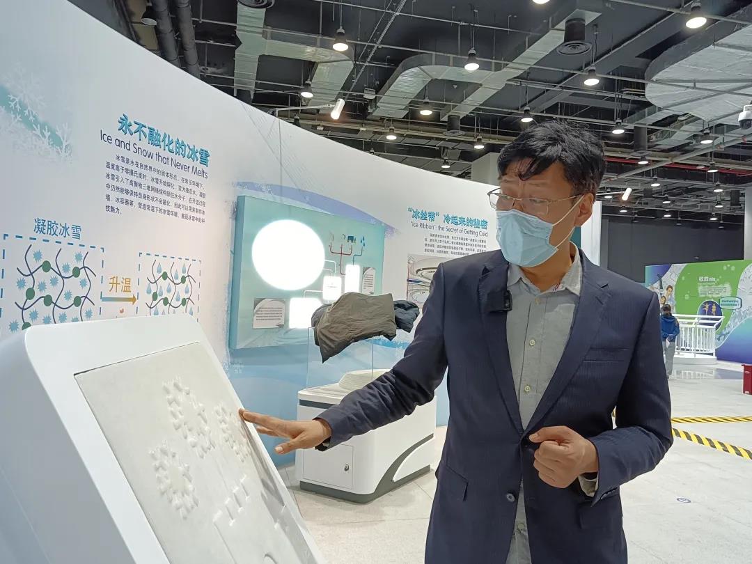近日,在中國科技館,張凱團隊制備的凝膠冰雪冰板在“科技冬奧”主題展上亮相。展臺不大,但吸引了不少路過的觀眾。大家出于好奇,就會伸手摸一摸。小朋友特別喜歡,半個身子撲上去,大叫著:“涼的,涼的,還滑滑的!這是冰呀!”