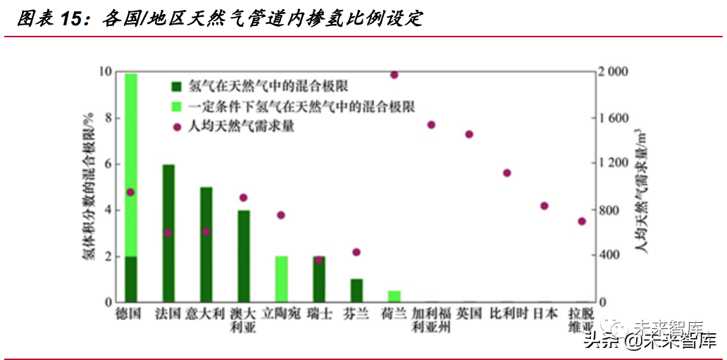 氫能產業發展初期階段,管道氫可由天然氣管道摻氫來實現過渡。由于純氫管 道的初始投資較大,不適合作為氫能發展初期應用,在管道運輸發展初期,可以積極 探索摻氫天然氣方式,即利用已建設的天然氣輸配管網與基礎設施進行天然氣和氫氣 混合輸送,也可經改造后輸送純氫,可實現低成本、規模化、連續性氫能供應。研究 結果表明,在含量較低時(10-20%摻氫比例),氫氣可以在不做重大技術調整的情況 下摻混至天然氣。未來大力發展天然氣摻氫管道輸送技術,關鍵需要解決管材、調壓 站、流量計、探測器等配套裝備的摻氫相容性與適應性并完善管網安全運行保障技術。 天然氣摻氫管道輸送技術是目前進行大規模、長距離氫氣輸送最為有效手段之一。