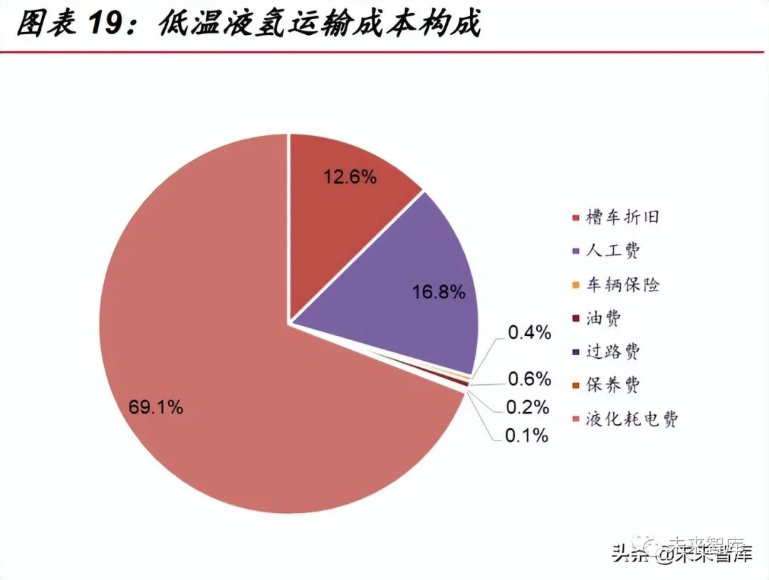 低溫液態氫儲運是將氫氣冷卻至 21K(約-253 攝氏度),液化儲存于低溫絕熱液氫罐中,儲氫密度可達到 70.8kg/m3,是標況下氫氣密度 0.083kg/m3 的近 850 倍, 單臺液氫運輸罐車的滿載約 65m3,可凈運輸 4000kg 氫,大大提高了運輸效率,并 且在液化過程還能提高氫氣純度,相應程度上節省了提純成本。因此液氫適合長距離、 大容量儲運,是配合我國未來實現大規模綠氫脫碳應用的首要儲氫選擇。