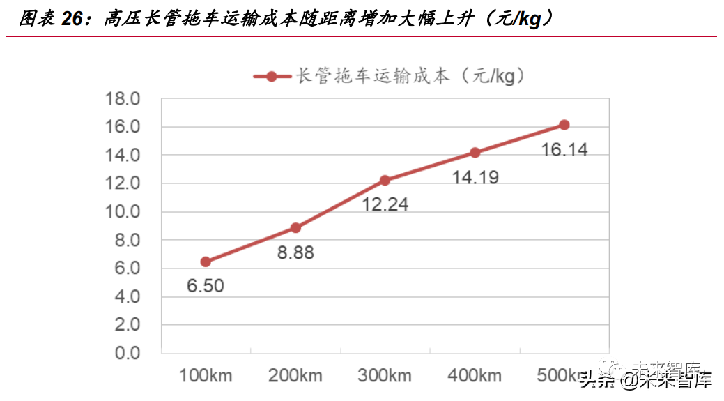 高壓長管拖車運輸成本隨距離增加大幅上升。根據以上假設,可測算出規模為 500kg/d、距離氫源點 100km 的加氫站,運氫成本為 6.50 元/kg。隨著運輸距離的增 加,長管拖車運輸成本逐漸上升。距離 500km 時運輸成本達到 16.14 元/kg(注:當 輸送距離超過 200km 后,單輛拖車已無法實現當日往返多次來滿足用氫需求,超過 200km 后,我們以多輛拖車同時運輸來計算)。因此,考慮到經濟性問題,長管拖