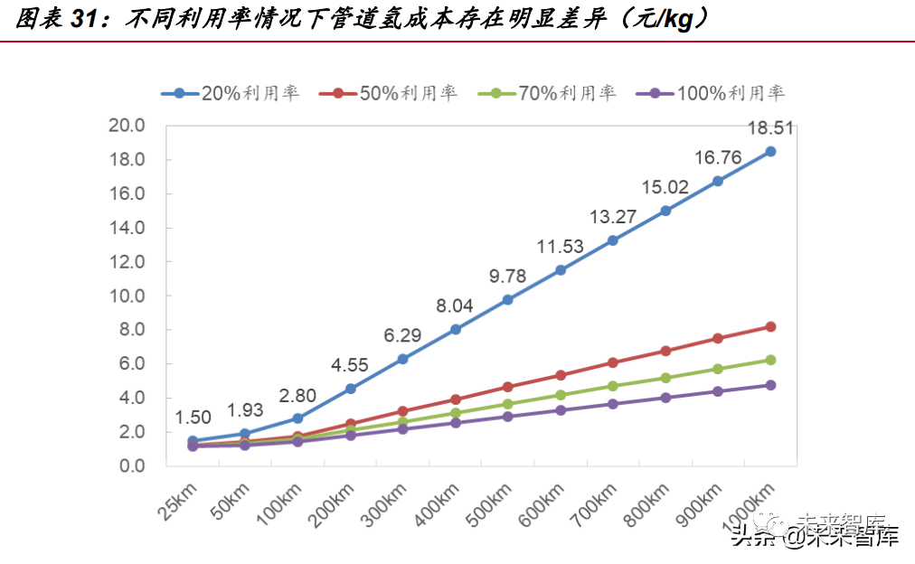 管道氫成本很大程度上受到需求端(利用率)的影響。在上述管道氫成本預測 中,我們假設管道運能的利用率達到 100%,在這種水平下,管道氫運輸成本表現出 非常低的水平,但隨著利用率水平的下降,管道氫成本陡然上升,當運能利用率僅為 20%時,管道運氫的成本已經接近長管拖車運氫。在當前加氫站尚未普及、站點較為 分散的情況下,管道運氫的成本優勢并不明顯。隨著氫能產業逐步發展,氫氣管網終 將成為低成本運氫方式的最佳選擇。