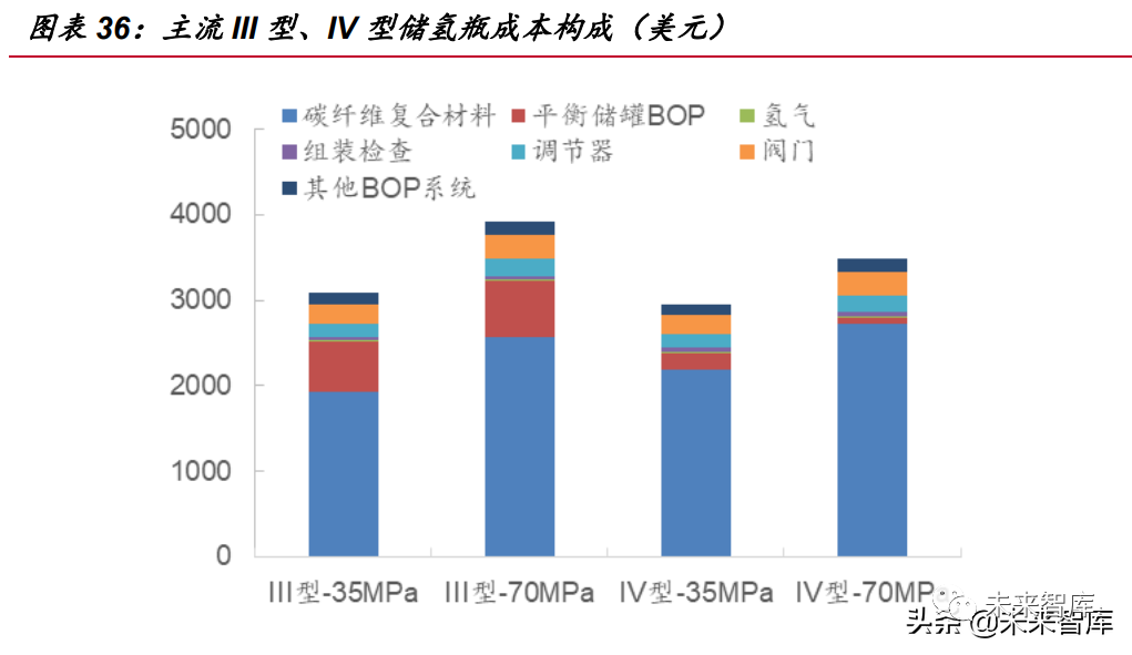 根據DOE及中科院寧波材料所測算,對于儲氫質量均為5.6kg的35MPa、70MPa 高壓儲氫 III 型、IV 型瓶成本組成來看,主要成本貢獻者是碳纖維復合材料,均占到 總成本的 70%左右水平。此外,當 III 型及 IV 型瓶儲氫壓力增至 70MPa 時,碳纖維 復合材料應用成本及比例大幅提升。因此降低碳纖維應用成本是儲氫瓶降本的關鍵。